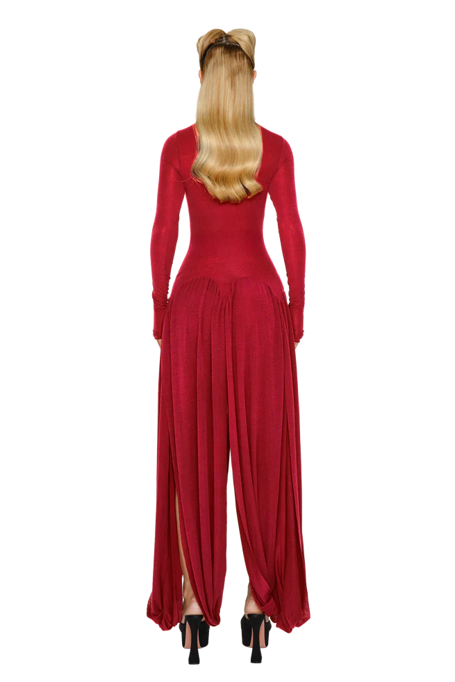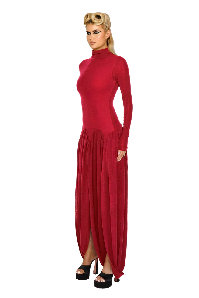 Long-sleeved maxi dress in Black Bear. High neck body crafted in luxurious knit. Elegant, low, scalloped waist elongates torso and lengthens legs. Splits into petals of skirt.