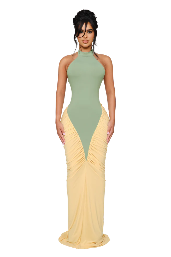 A full-length halter dress in a stretchy cotton-touch fabric that hugs the body through the bust and hips before falling into a gathered fishtail skirt. Designed in two-tone black and cream for a contouring effect. The back is completely open with a wide band across the lower back. Finished with a clean raw hem for natural movement and drape.
