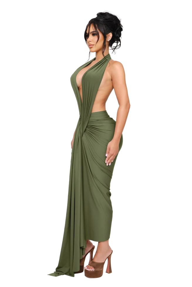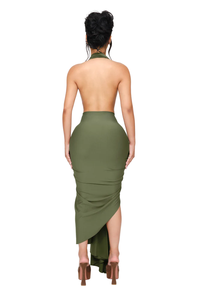 Backless halter midi dress in cotton-touch stretch jersey. Features a soft draped front panel and a neckline that can be twisted and styled in multiple ways. Designed to sit low on the hips or higher on the waist. Raw edge finish. Pull-on style with no fastenings.